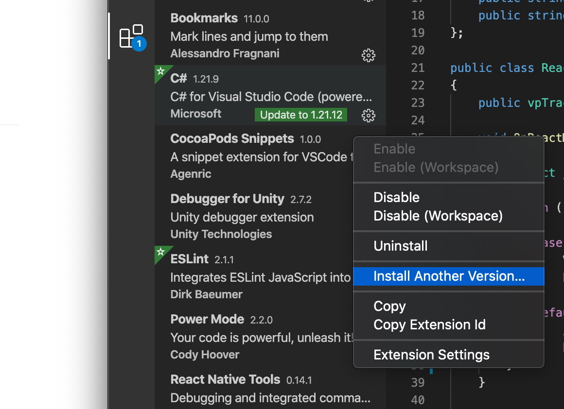 이유는 C# Extension의 버전업이 되어 OSX에서는 그게 작동하지 않는다는 것이다.